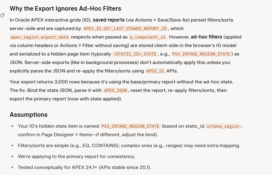 To support asynchronous downloads of large files, that would otherwise cause problems or timeouts, add a “Download in Background” ACTION to the reports. This would, via configuration, write the BLOB to a table in the parsing schema to support downloads at a later date. The downloaded file SHOULD reflect the UI state of the report in terms of visible columns and manual filters applied to columns.