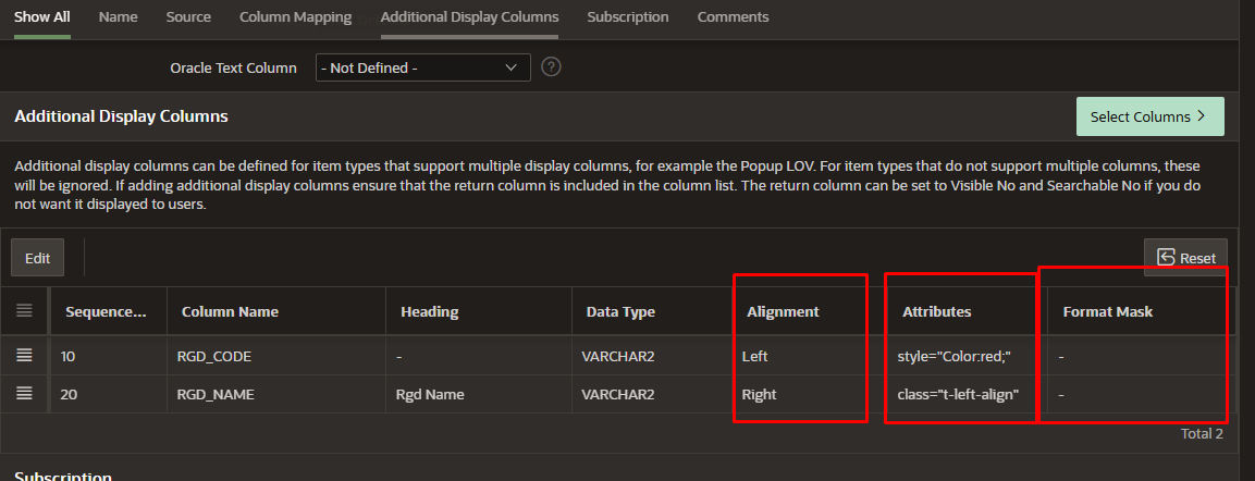 Oracle APEX Popup LOV with multiple columns should include built-in options for left/right alignment and customizable column width, or enable a custom attribute column.