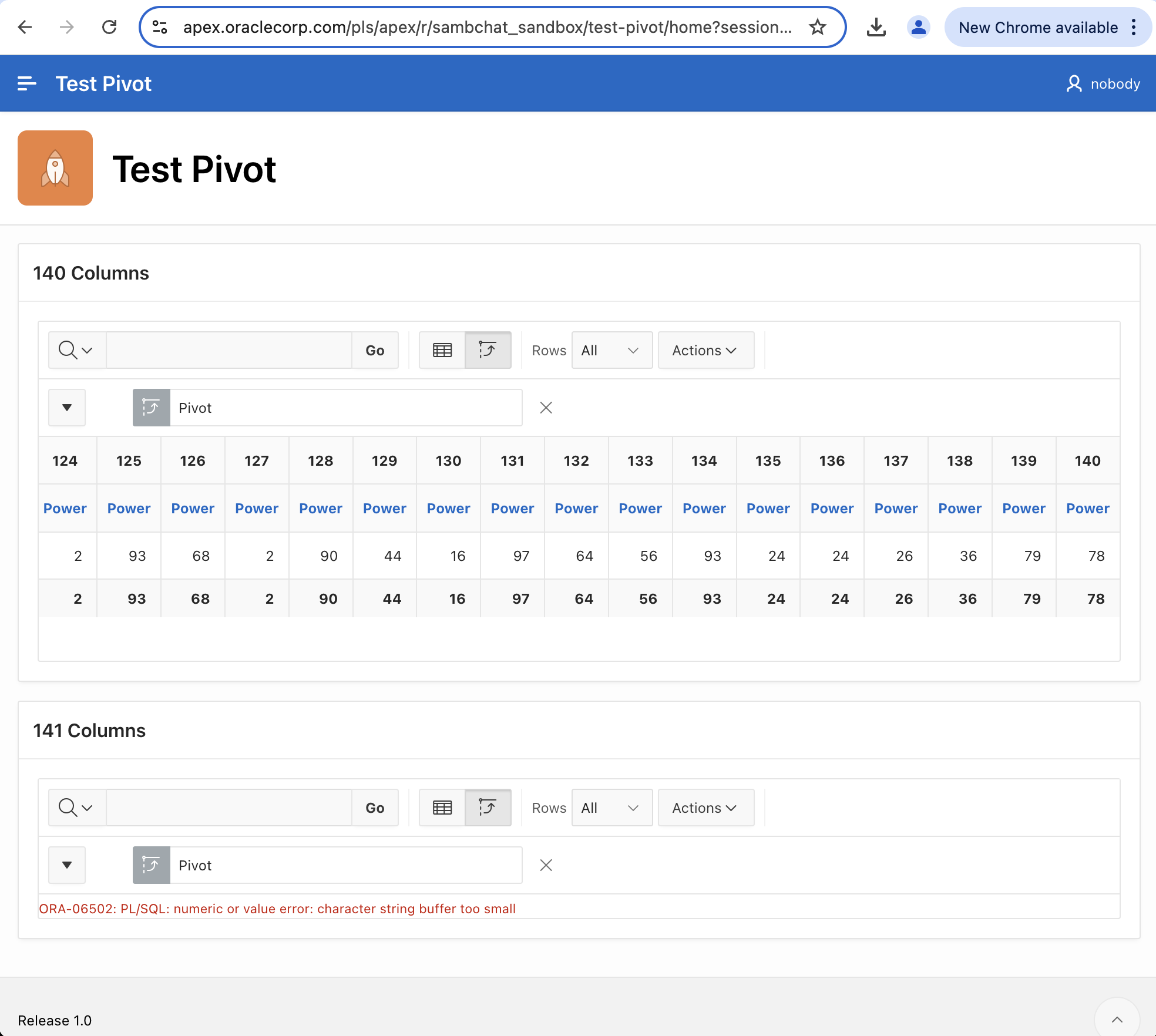 The test application is just to showcase the issue, we are extensively using Pivot tables in our APEX app running in production and we are running into this error message and the requirement is to show around 300 columns in a Pivot table.