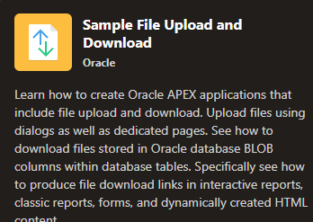 Oracle APEX should have an out of box Region/component called Attachment which will display all the attachments for a given ENTITY_NAME AND ENTITY_ID . Also it should have upload/view/delete atatchment option.
