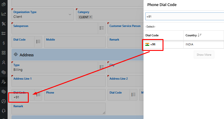 - Selecting a phone dial code where the user can see the country’s Font Awesome flag icon next to the code.