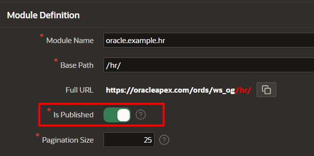 ORDS.DEFINE_TEMPLATE and ORDS.DEFINE_HANDLER) to accept a p_status or p_published parameter.